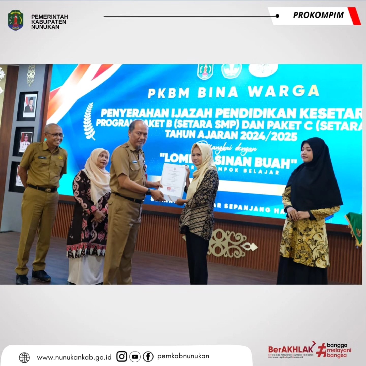 NUNUKAN  – Asisten Pemerintahan Dan Kesra, Muhammad Amin SH mewakili Bupati Nunukan secara resmi menyerahkan Ijazah Pendidikan Kesetaraan (Paket) kepada puluhan peserta didik program pendidikan kesetaraan Paket B, dan C lulusan PKBM Bina Warga Nunukan dalam sebuah prosesi yang berlangsung di Lantai 5 Kantor Bupati Nunukan, Selasa, 02 Desember 2025