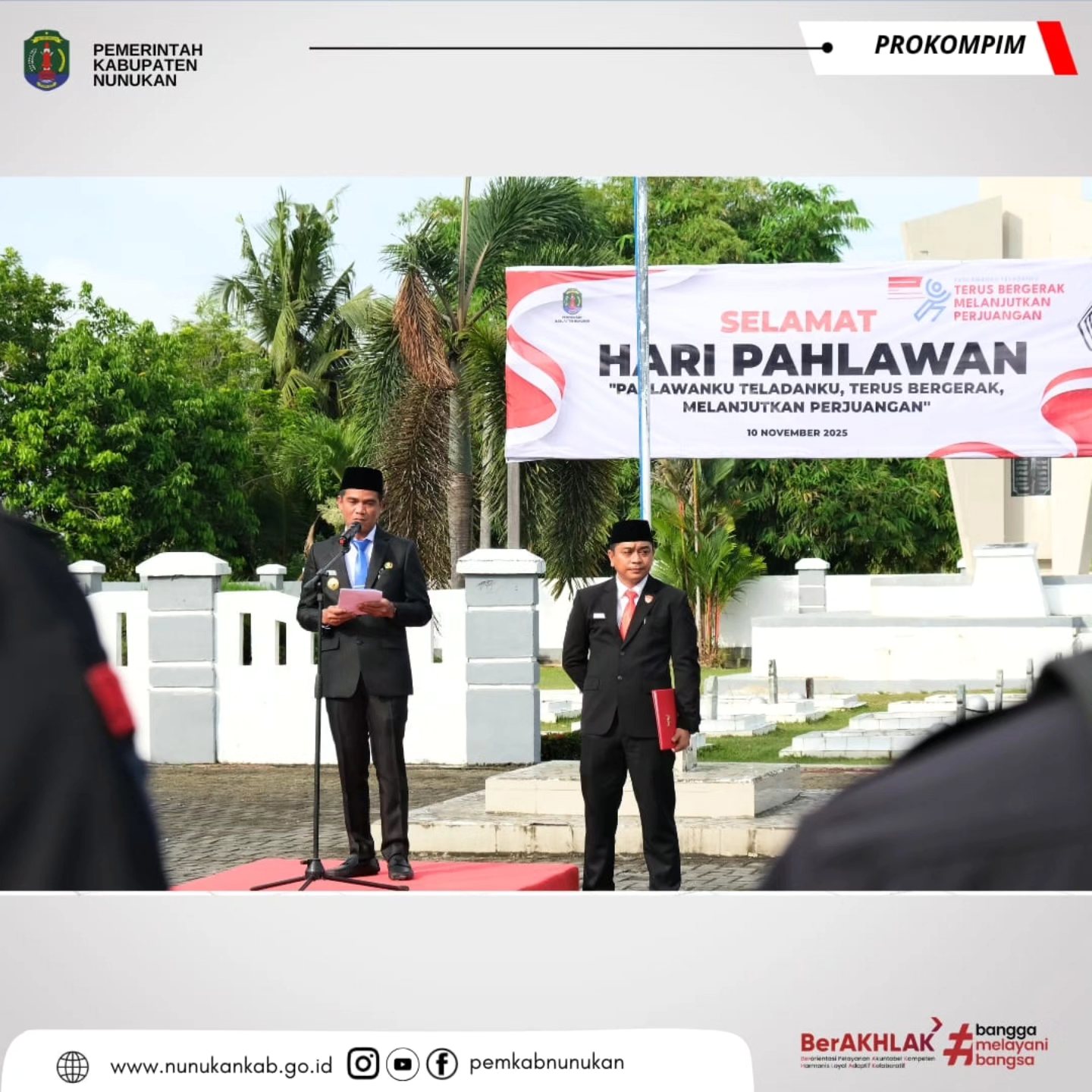 “Pahlawanku Teladanku, Terus Bergerak, Melanjutkan Perjuangan” adalah tema Hari Pahlawan Tahun 2025. Pemerintah kabupaten Nunukan memperingati hari pahlawan dengan melaksanakan Upacara Bendera di di Taman Makam Pahlawan (TMP) Jaya Sakti Nunukan, Senin (10/11/2025).